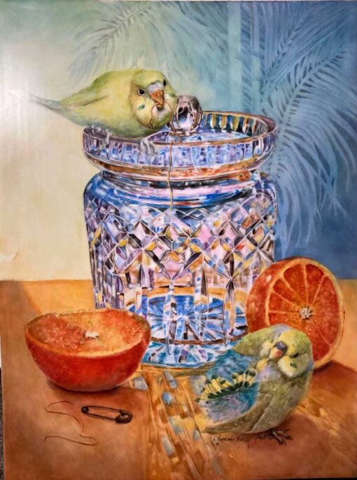 You are most likely aware that the budgies (parakeets) are very playful and sometimes mischievious. That is what this painting is depicting. A beautiful light is streaming from the back and travels throught the crystal container onto the table and the objects beyond. The soft backgroung emphasizes the main characters and the plot. These cute little guys will entertain!