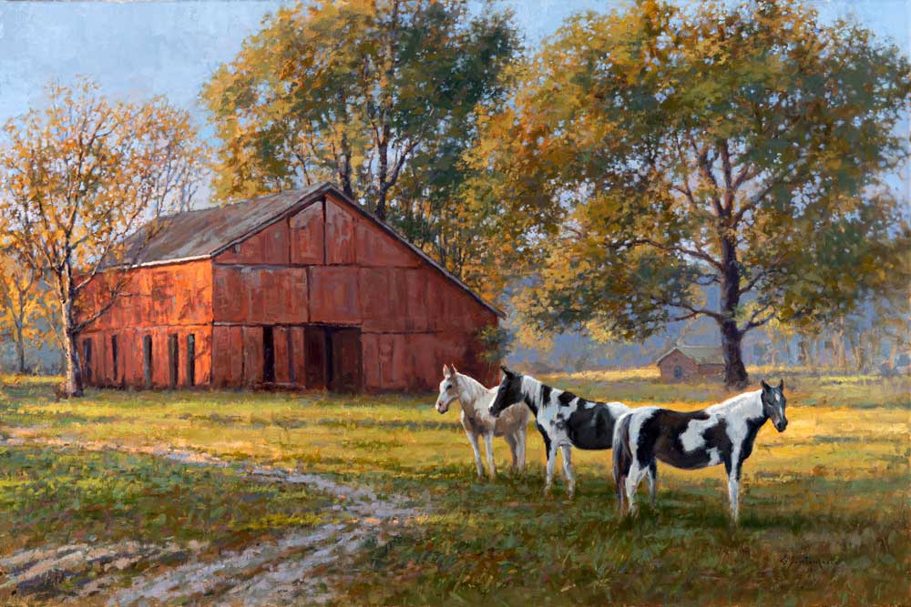 Augusta, Missouri is known for its vineyards and old barns. A warm golden light washes over a quiet scene of horses grazing near a red barn, their forms softly glowing in the evening sun. Long shadows stretch across the land, and the sky shines with gentle warmth, capturing a peaceful moment at day’s end.
