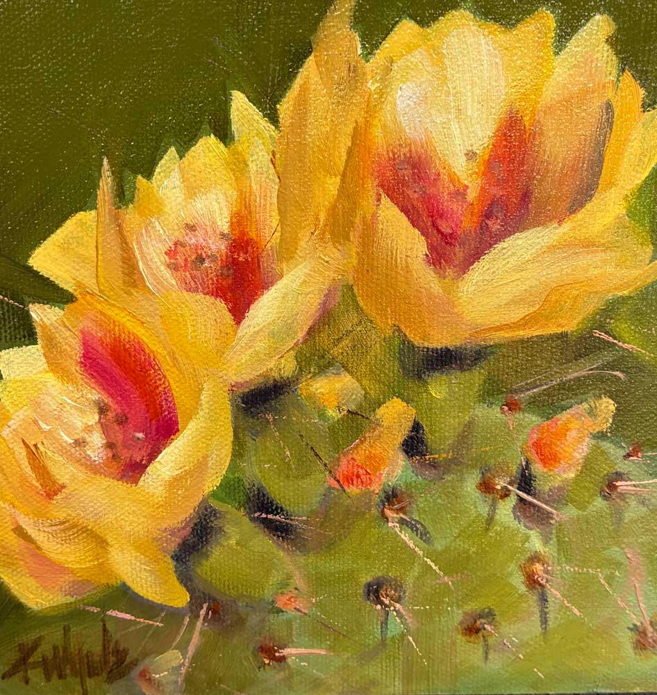 A walk in our backyard provides the ultimate cactus experience. These prickly pear blooms caught my eye, so I took a photo and painted them on a small panel at the studio. I wanted to capture the color and shapes of the cactus…along with some sharp needles. This is a small but mighty painting!